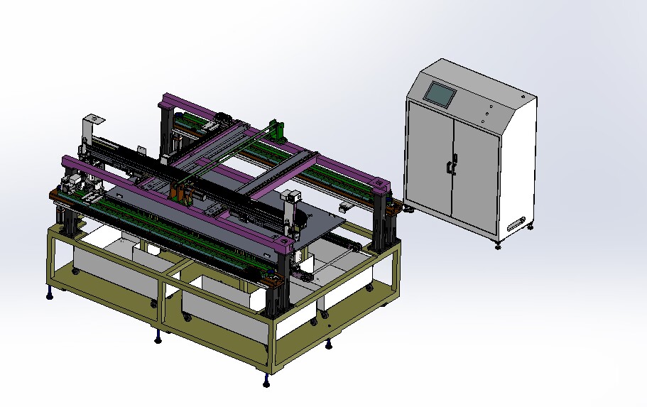 自動排版機的主要功能單元有:玻璃輸送定位系統(tǒng)、抓取行走系統(tǒng)、視覺檢測系統(tǒng)、電控系統(tǒng)等;通過以上功能單元,實現(xiàn)了將自動串焊機串焊好的電池串,按照工藝尺寸要求和排版方向順序自動排版鋪設到玻璃(EVA已經(jīng)鋪設)上,組成電池串陣列。玻璃/EVA通過傳輸線傳輸至指定位置,機械手抓取電池串實現(xiàn)CCD定位、自動旋轉、自動排版功能。設備通過同步帶傳輸與自動生產線對接,實現(xiàn)了自動流水作業(yè)。